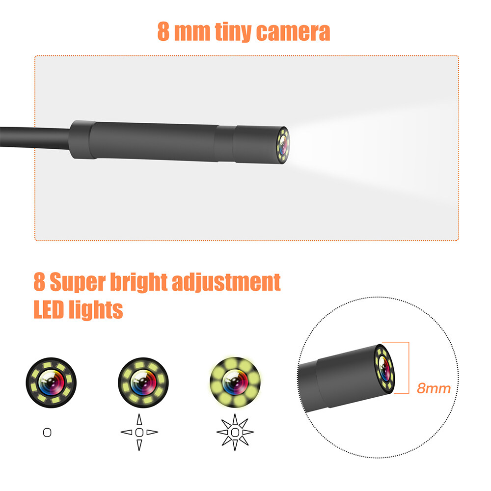 1. [ 8MM DIAMETER PROBE & hard CABLE] : Small tip diameter of 8 mm (0.3 in.), with a wide field of view, perfect inspection device for most applications, such as pipe clogs, wall inspection, vehicle and home appliance maintenance, aircraft or car engine checking, carbon deposition, cylinder checking etc.
