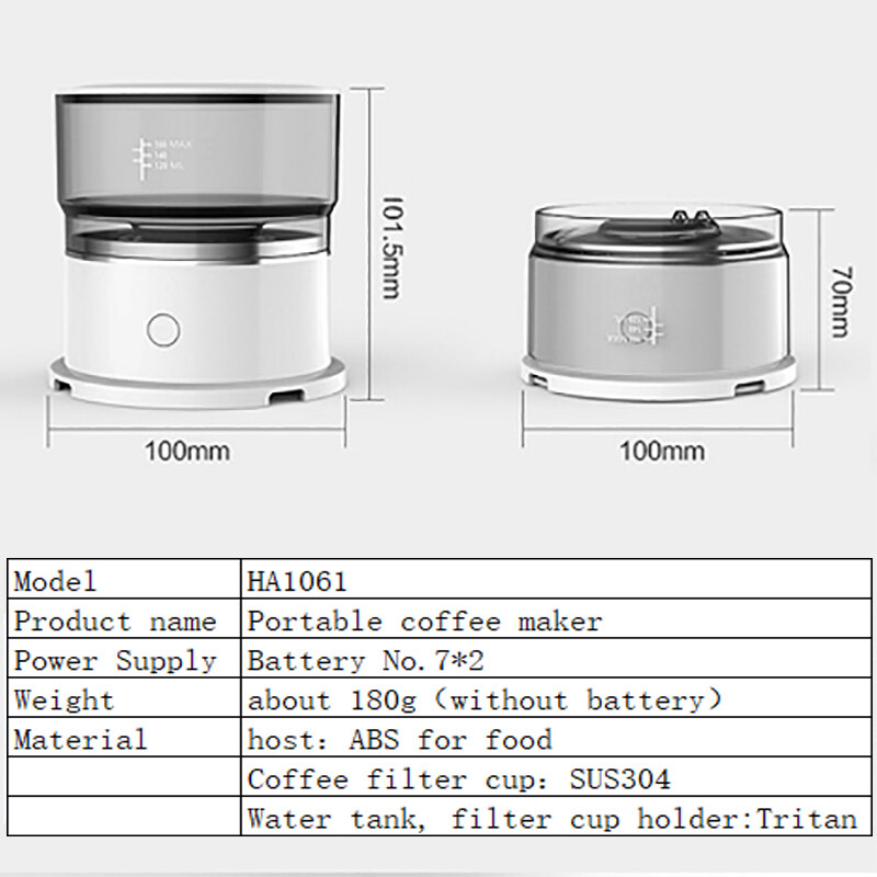 Specification:Product Name: Portable Electric Coffee MachineProduct color: whitePower supply mode: batteryMaterial: ABS + Tritan + 304 stainless steelProduct use: Travel / Sports / Office / HomeProduct net weight: about 0.18kg