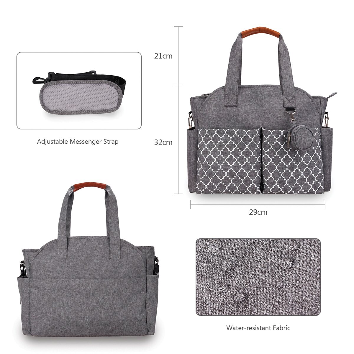 Features & Accessories: Convert from a hand bag to a messenger diaper bag, water-resistant fabric and lining for easy to clean, includes cushioned changing mat, clip-on stroller strap