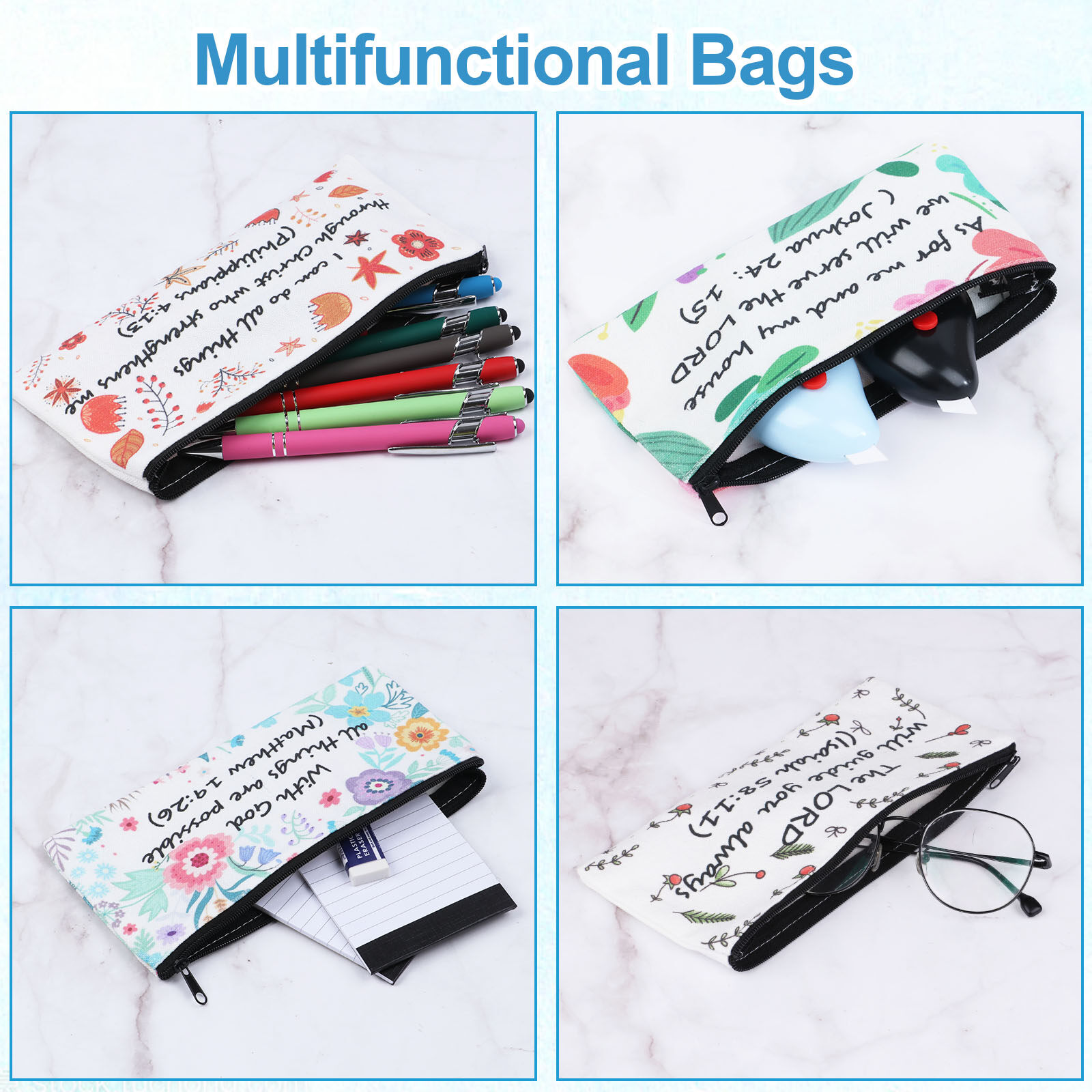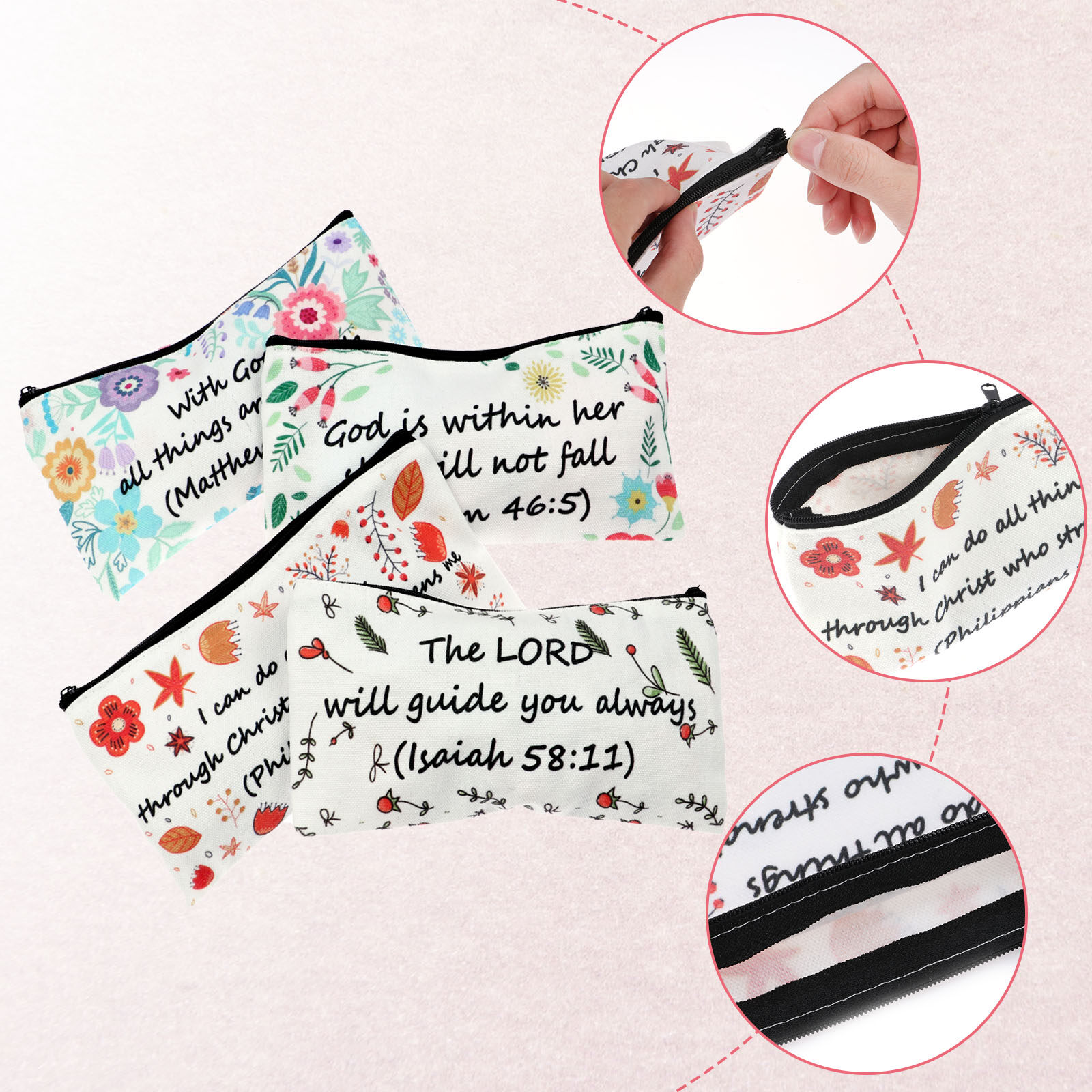 Perfect Gift :The pencil bags with colorful flower patterns and bible verse text design really accents the theme you are going for. Practical gifts for Christian friends, family members, etc. The receivers will be cheerful to get such a delicate gift. Great for storing a variety of pens, pencils, eraser and other small things to study bible.