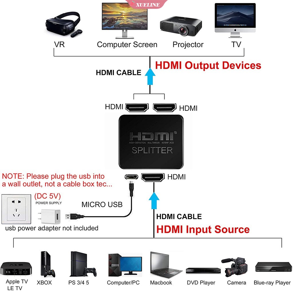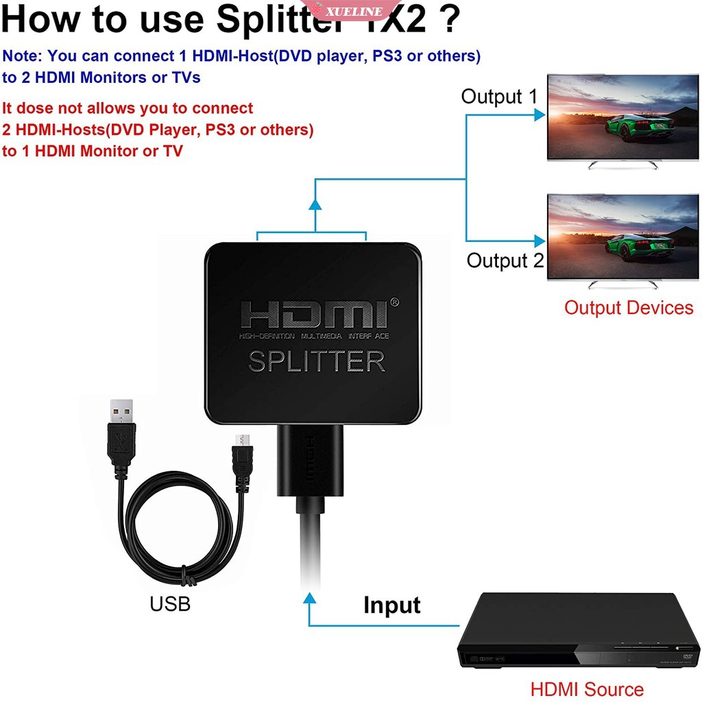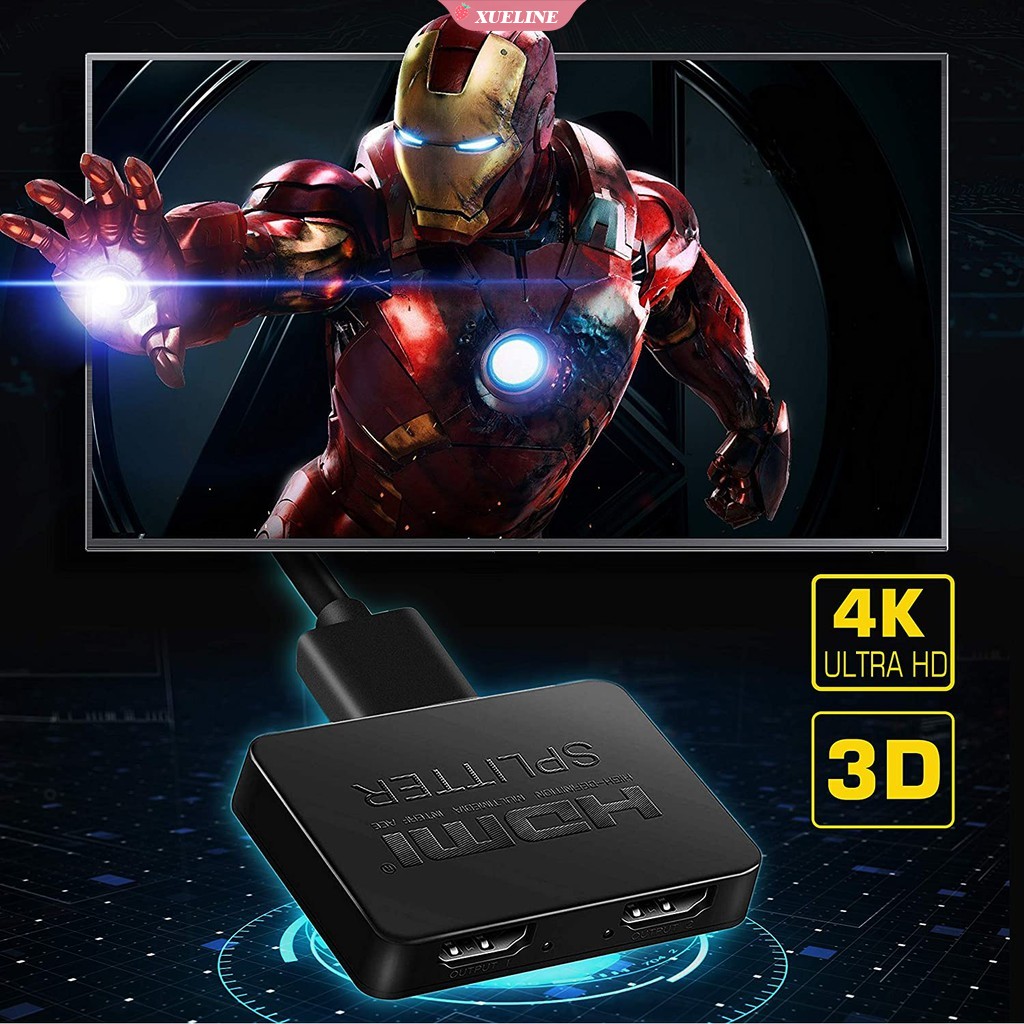 4K HDMI splitter 1 in 2 output can amplify and distribute HDMI signals to two displays at the same time without causing video quality distortion Xueling