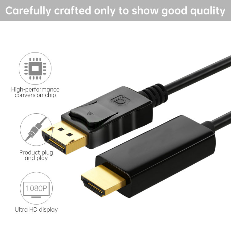 Compliant with HDMI 1.3a specification up to 2.25Gbps.PC:VGA, SVGA, VGA, SXGA, UXGA and UXGA.HDTV: 480i, 576i, 480p, 576p, 1080i, and 1080Length: 1.8m (6ft)Connect DisplayPort-equipped computers/devices to HDMI-enabled televisionsSupports both Audio and VideoNothing to install just plug and playPackage Included:1 x DP Cable