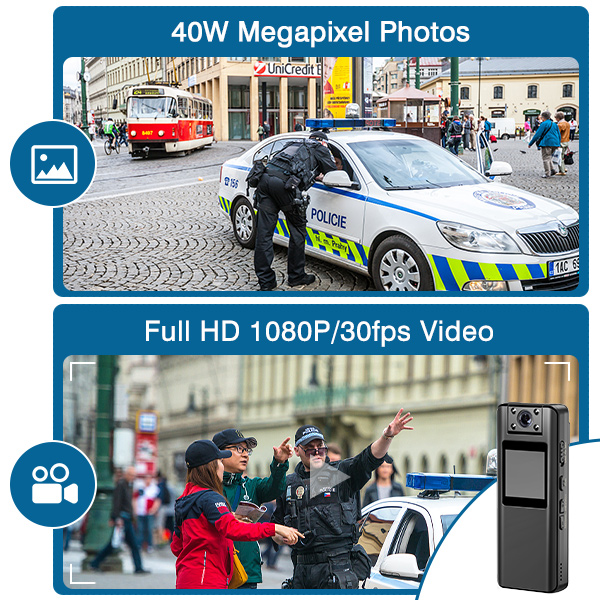 - A 1.3 inch LCD screen works for real-time viewing and managing the recorded videos/audios/photos on the mini body camera as you want, anytime anyplace.