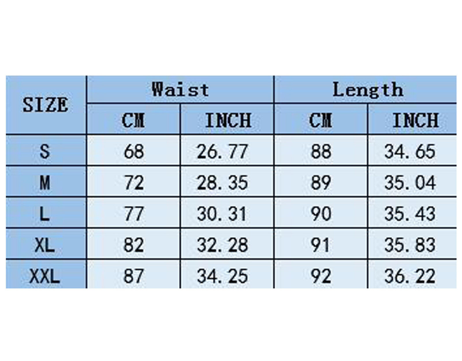 | Size:XXL | US Size:10-12 | UK Size:14-16 | EU Size:40-42 | Waist:87cm/34.25'' | Length:92cm/36.22'' |