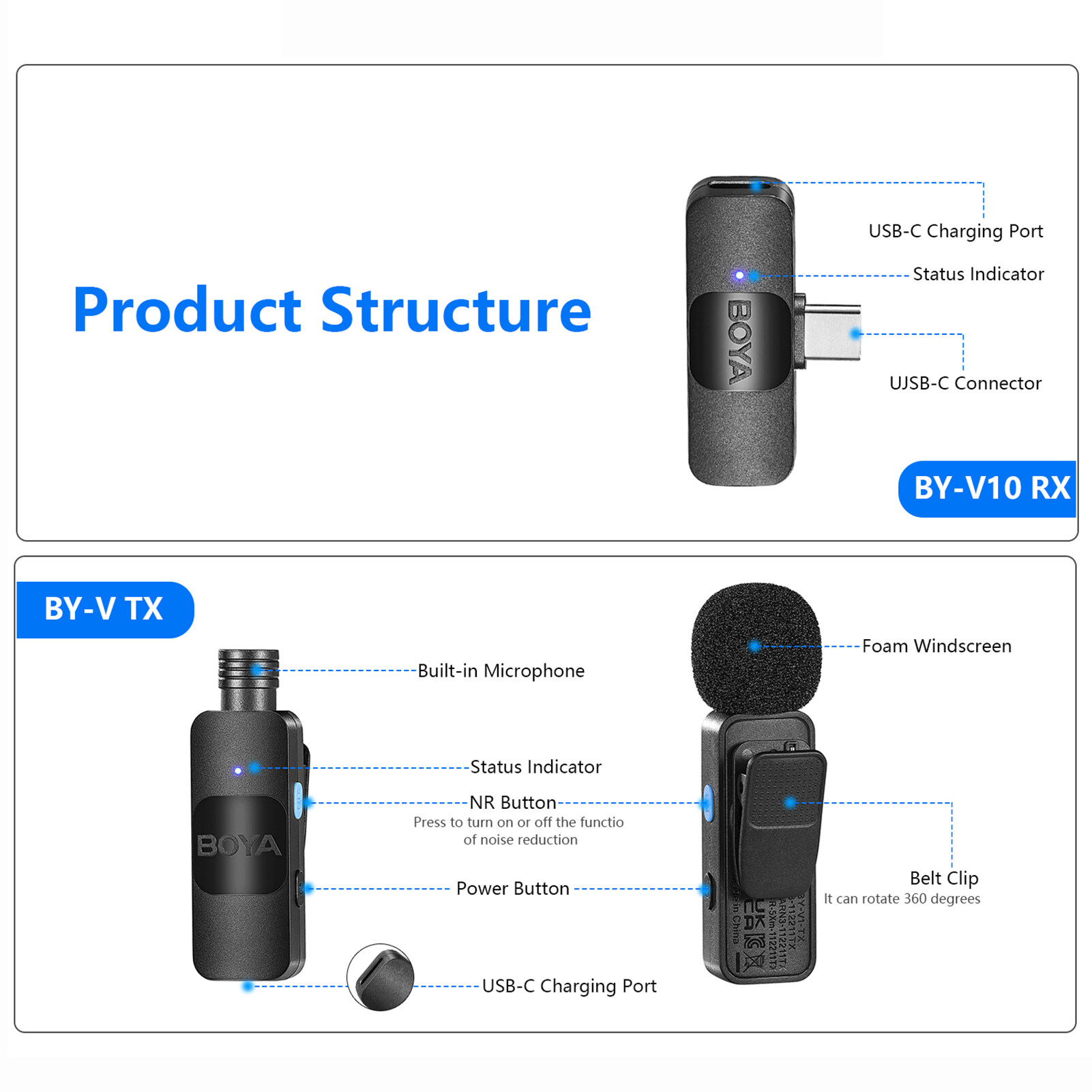 【Long Battery Life Span】The transmitter has built-in rechargeable lithium battery, long battery life, while the receiver is powered by external device and has a type-c charging port. You can charge your mobile phone while using the microphone system.
