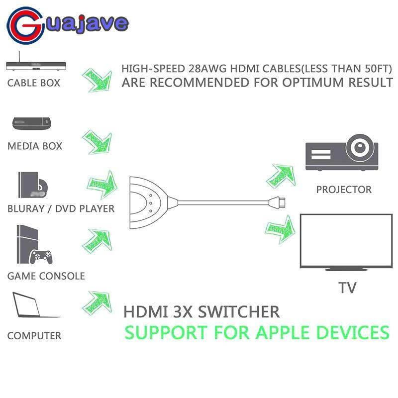 Guajave 3 Port HDMI Switch Splitter Cable 4K*2K 2160P Multi Switcher HUB for LCD HDTV PS Xbox