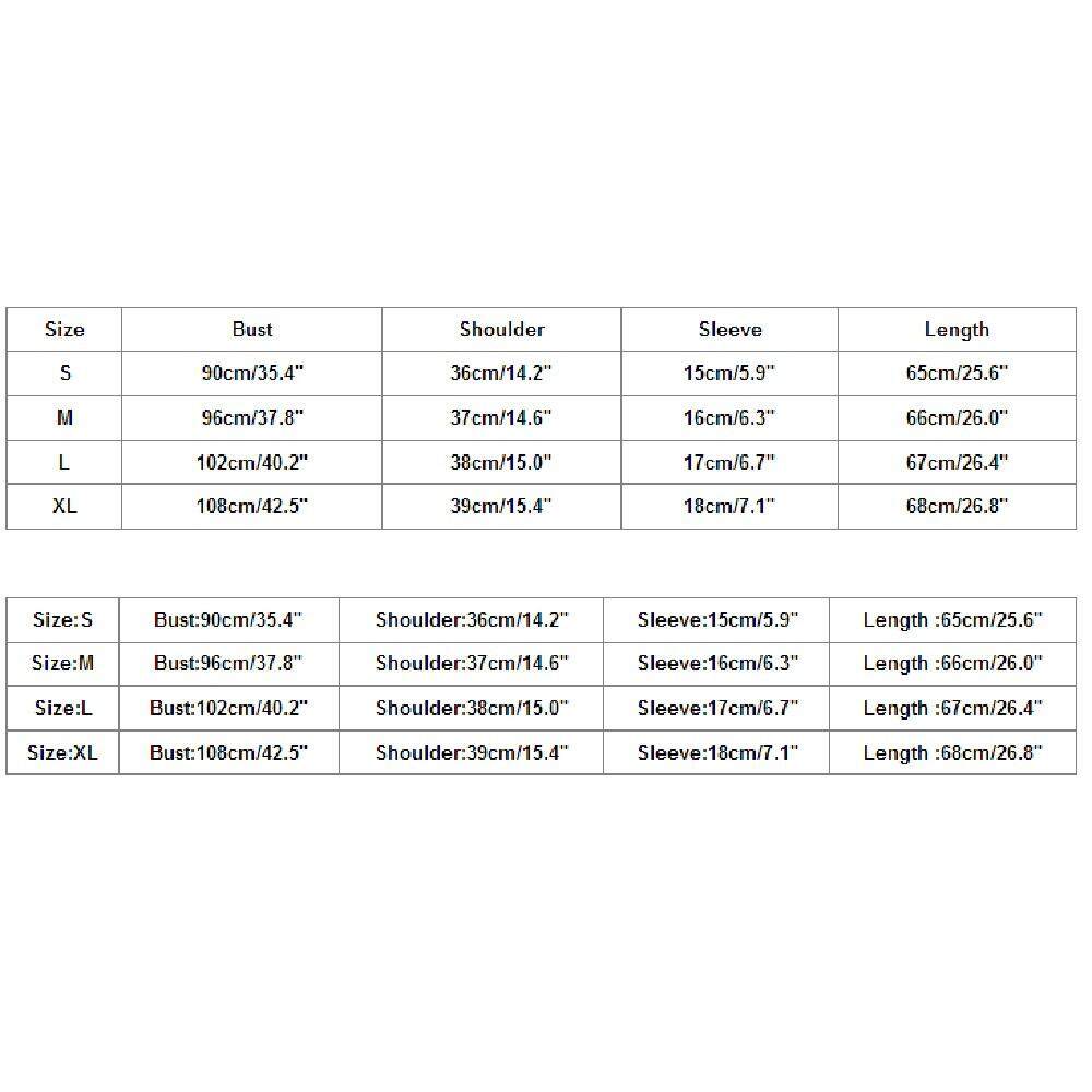 | Size:L | US:8 | UK:12 | EU:38 | Bust:102cm/40.2" | Shoulder:38cm/15.0" | Sleeve:17cm/6.7" | Length :67cm/26.4" |