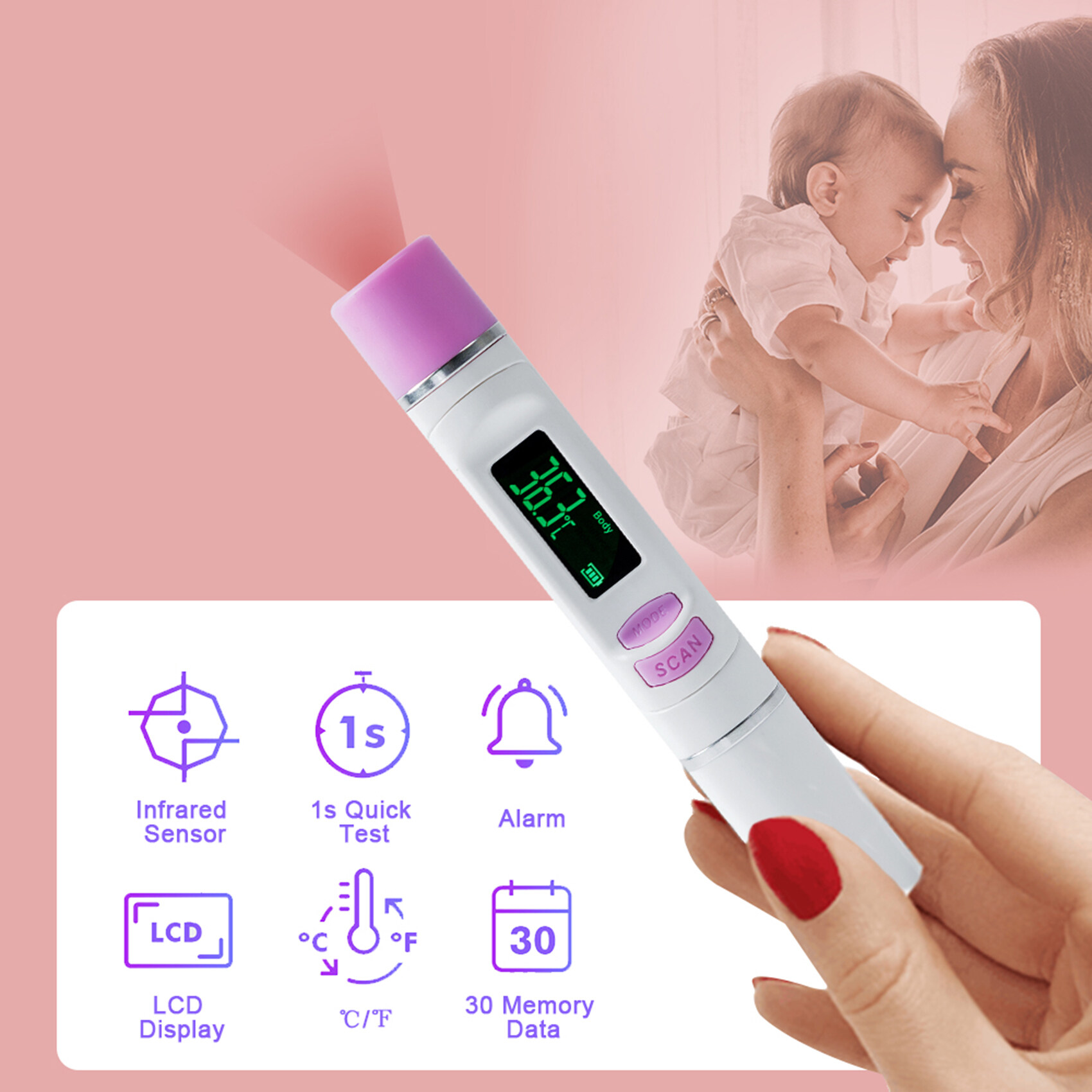 Intelligent Temperature Warning: When <32°C/89.6°F, it displays "Lo". When >43°C/109.4°F, it displays "Hi". At the same time, it rings “Bi Bi” for warning.